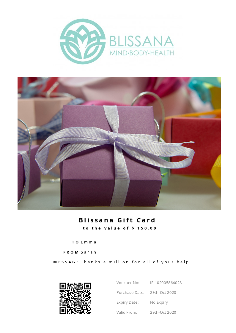 Blissana allows you to purchase instantly printable gift vouchers, special offers and tickets using the Voucher Connect platform.